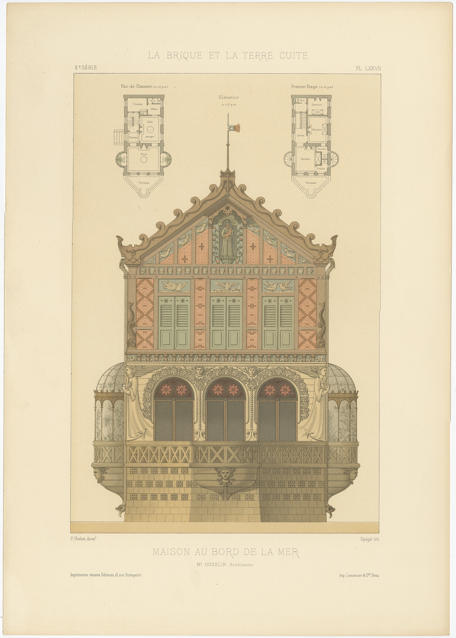 Description: Antique print titled 'Maison au Bord de la Mer, Mr. Hügelin Architecte'. This print depicts the design of a building in France. Originates from 'La Brique et La Terre Cuite' by P. Chabat.