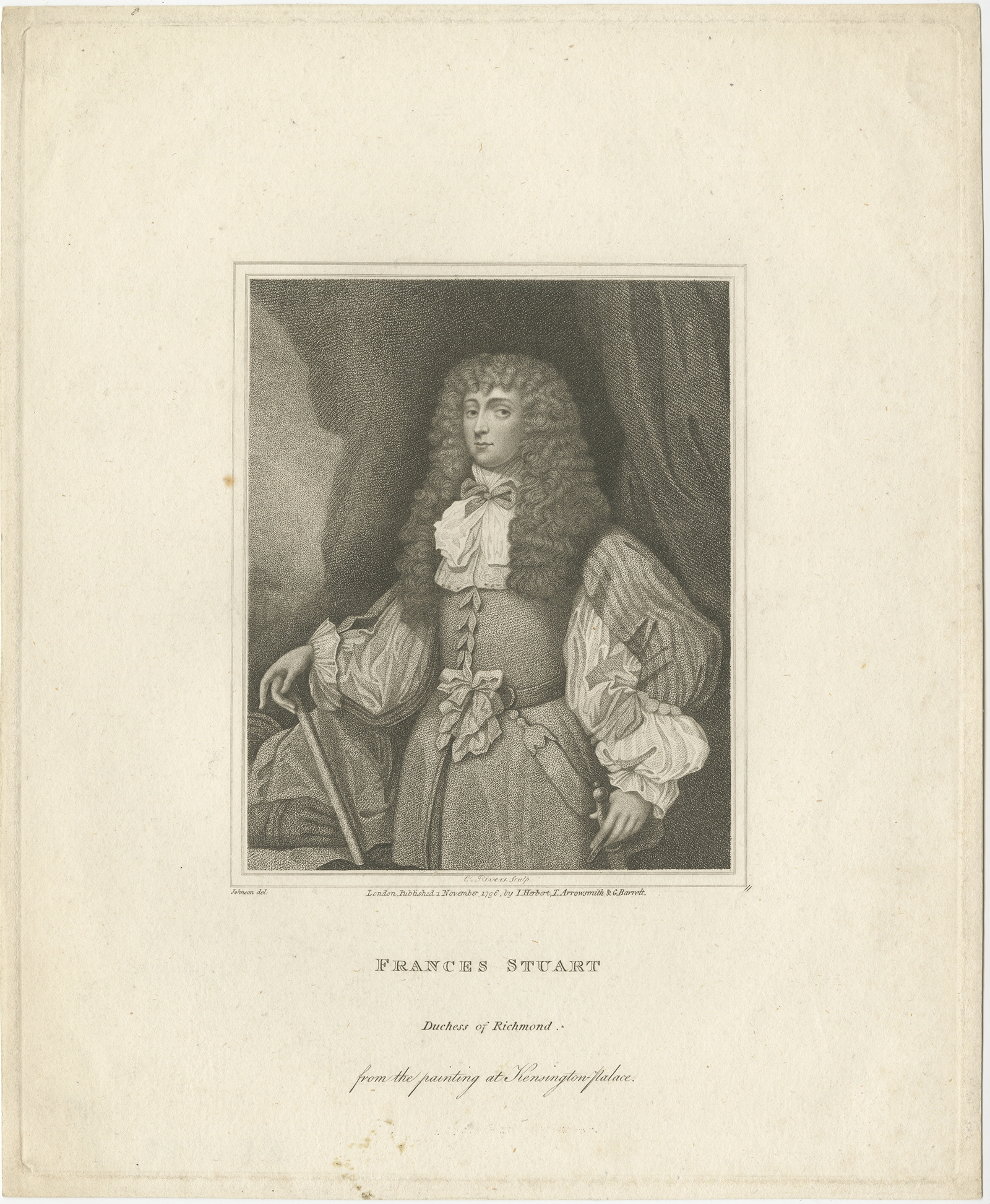 Description: Antique print titled 'Frances Stuart'. Portrait of Francess Stuart, Duchess of Richmond. This print originates from 'Memoirs of Count Crammont' by Hamilton.