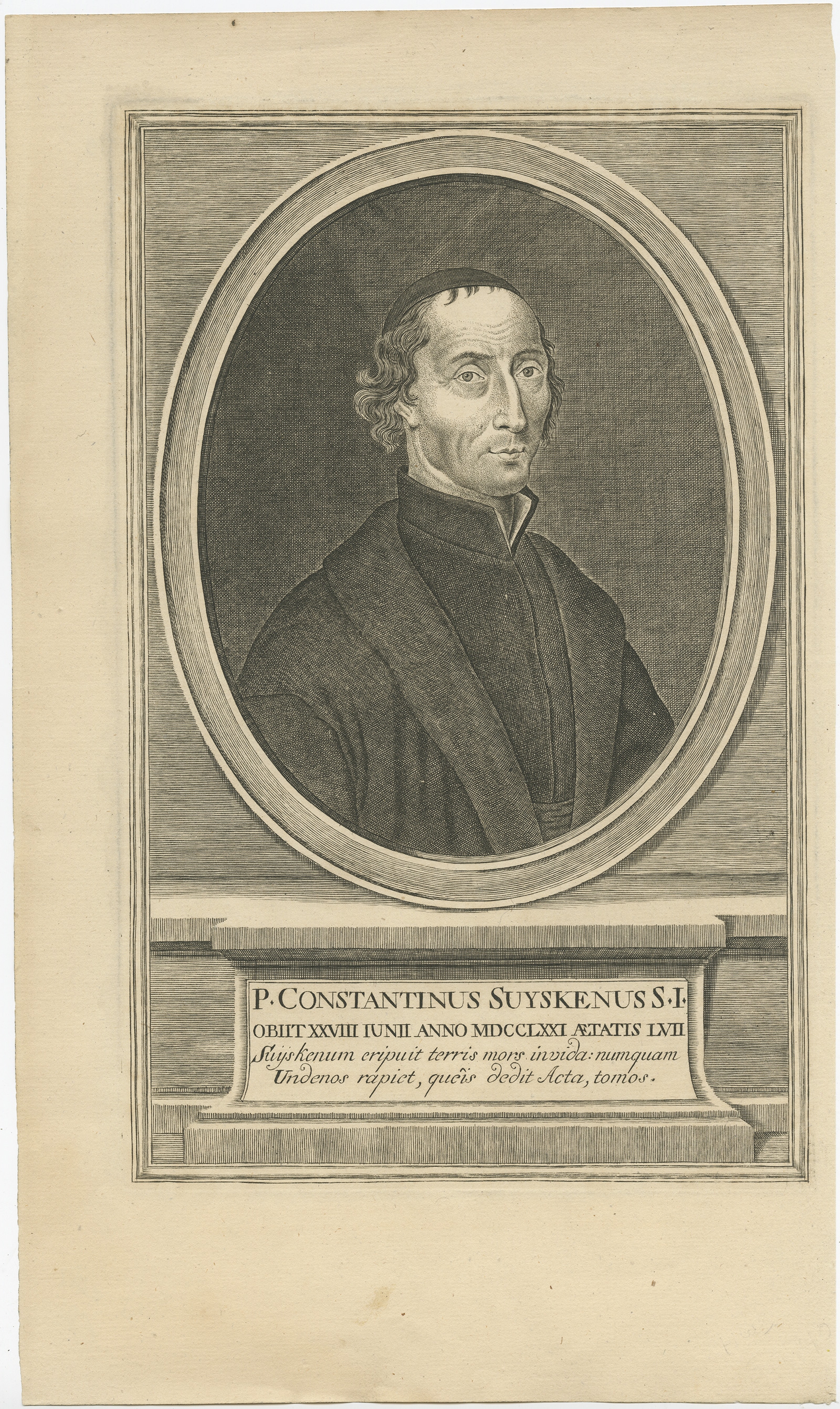 Description: Antique portrait titled 'P. Constantinus Suyskenus'. Old print of Constantinys Suyskenus, Belgian hagiographer and church historian. This print most likely originates from a volume of 'Acta Sanctorum'.