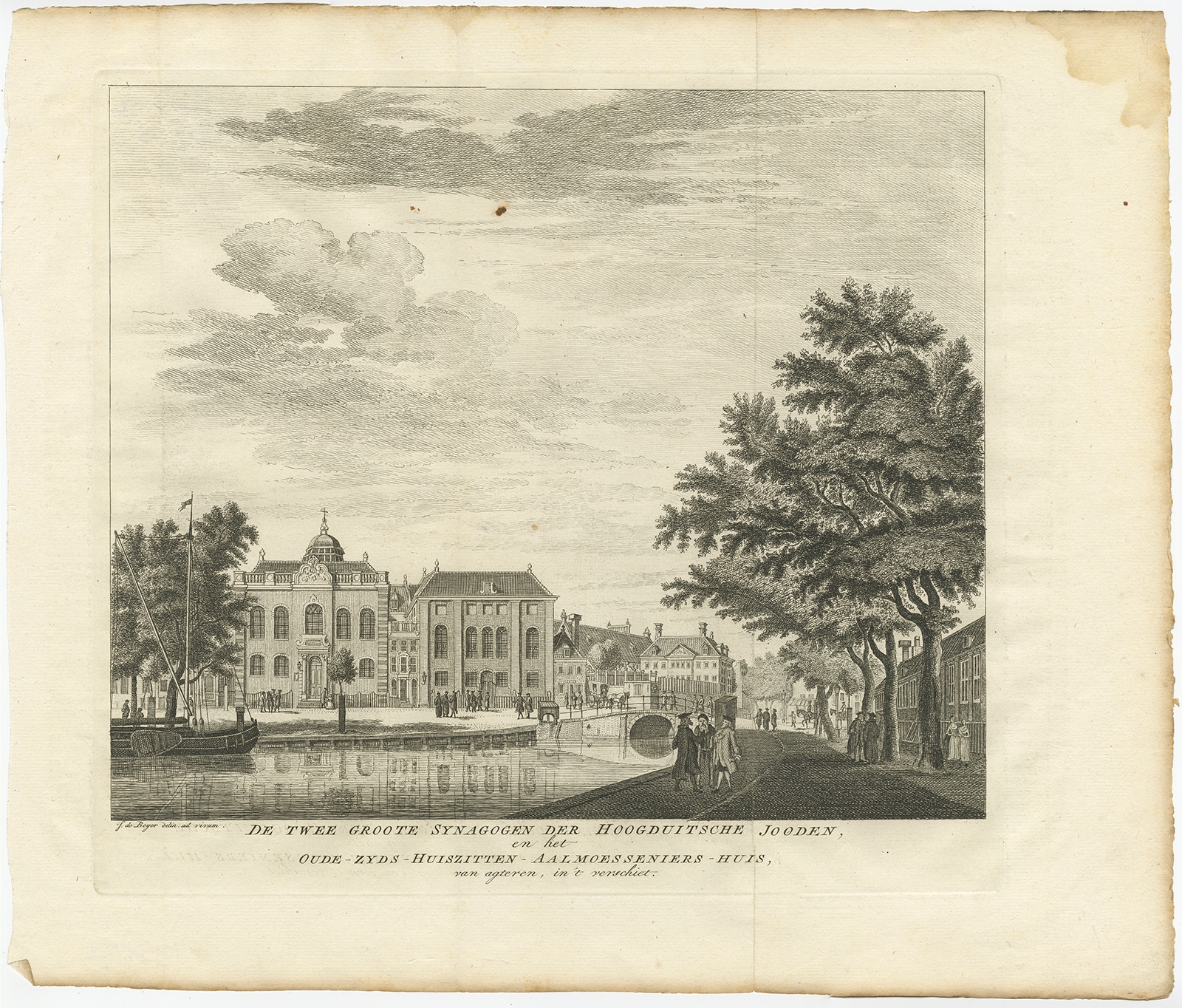 Description: Antique print titled 'De Twee groote Synagogen der Hoogduitsche Jooden en het Oude-Zyds-Huiszitten-Aalmoesseniers-Huis van agteren, in 't verschiet'. Old print depicting two large large synagogues of German jews in Amsterdam. Published circa 1760.